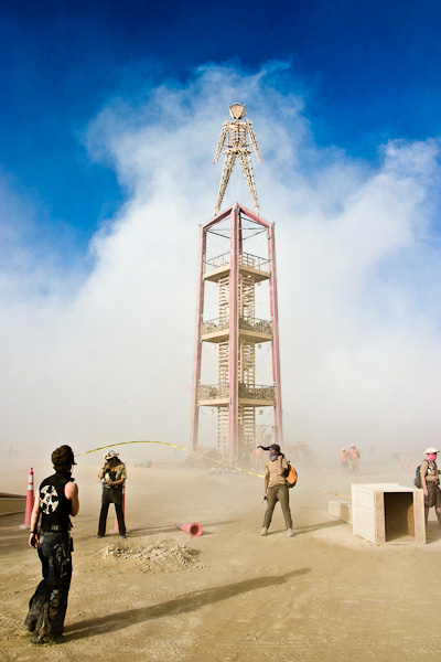 I once spent a couple of days at the Burning Man Art Festival in Nevada. Taking place on a dry, desert lakebed, more than 50,0000 people congregate to set up a temporary city for about ten days at the end of summer. The largest “leave no trace” event in the world, the playa is returned to its natural state for the the rest of the year. I was there just in time to experience a major white-out. For about six hours huge clouds of dust enveloped Black Rock City. The air became so opaque that you could get lost walking across the street, visibility being reduced to about two yards. In the photograph is the man himself—the one who is burned at the climax of the event. As seen here, he is about to be swallowed by the powdered earth.